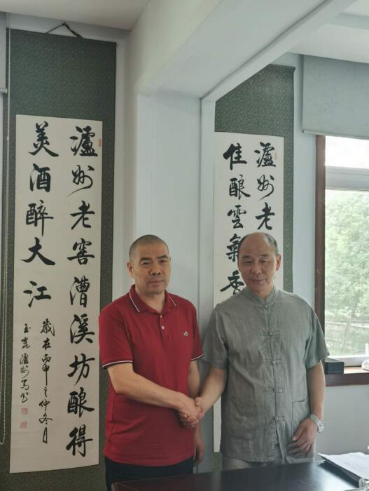 上海靈壁商會(huì)會(huì)長王德發(fā)先生(左)蒞臨公司考察合作。與公司釀酒大師瀘州濃香老窖傳統(tǒng)技藝第21代傳人陳靖余(右)合影